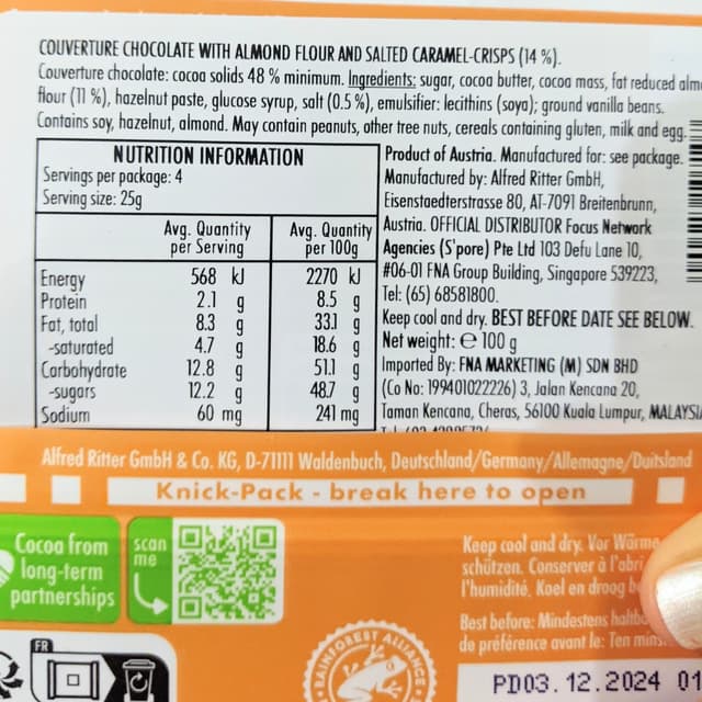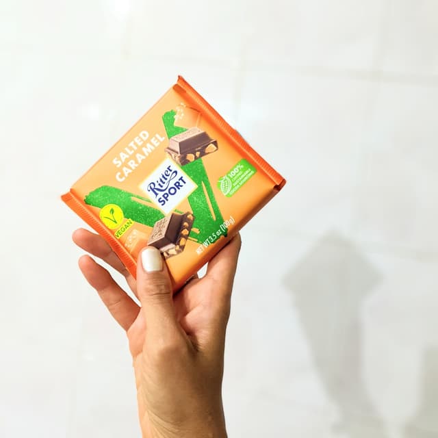 I've seen these vegan-marked Ritter Sport choc bars at the supermarket for quite some time and was excited to finally try it. The chocolate itself wasn't quite as almondy or hazelnutty as purported in the list of ingredients, and I actually found the crunchy salted caramel crisps quite annoying after a few chomps in - the texture was just too sticky, hard and clumpy. Wouldn't get it again but #atleastisatiatedmycuriosity