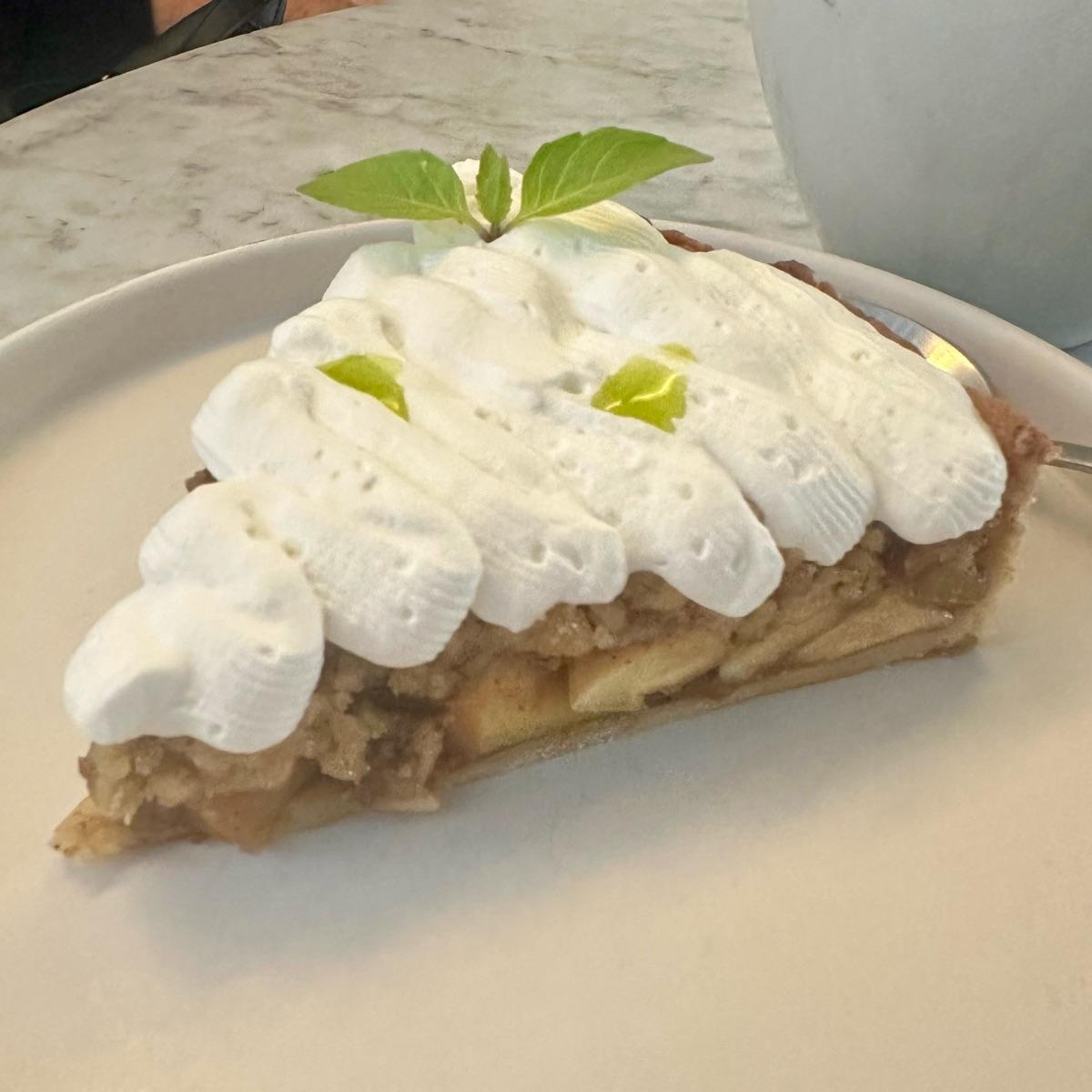 Este lugar es vegetariano-vegano pero lo bueno es que todos sus postres son veganos. Esta vez probé esta deliciosa tarta de manzana que estaba muy rica, sabía a manzana con canela el relleno y la crema batida le daba un sabor muy rico, es la tarta de temporada por lo que me imagino que pronto la van a cambiar. Está algo cara $130 si no mal recuerdo y es que la porción no es muy grande. Aún así, vale la pena de vez en cuando 😅 #sharethatrainbow #goveganfortheanimals #dairyfree #veganoptions