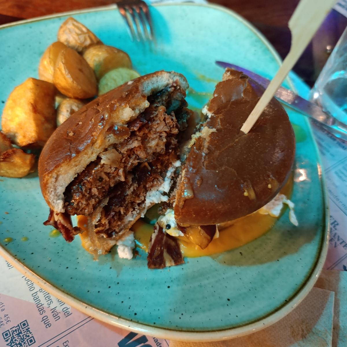 Espectacular hamburguesa. Enorme, la salsa de queso riquísima y las patatas de escándalo