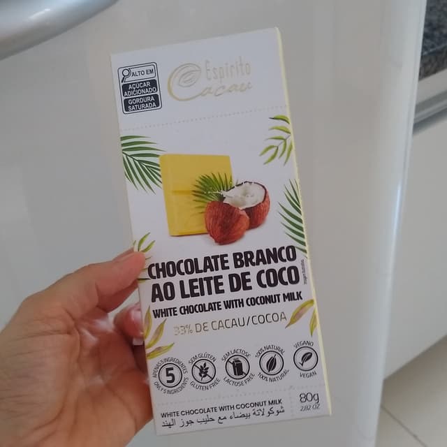 Está entre os melhores chocolates branco que já provei. Docinho (açúcar demerara), sabor de coco (coco desidratado), manteiga cacau 33%. É meio viciante.