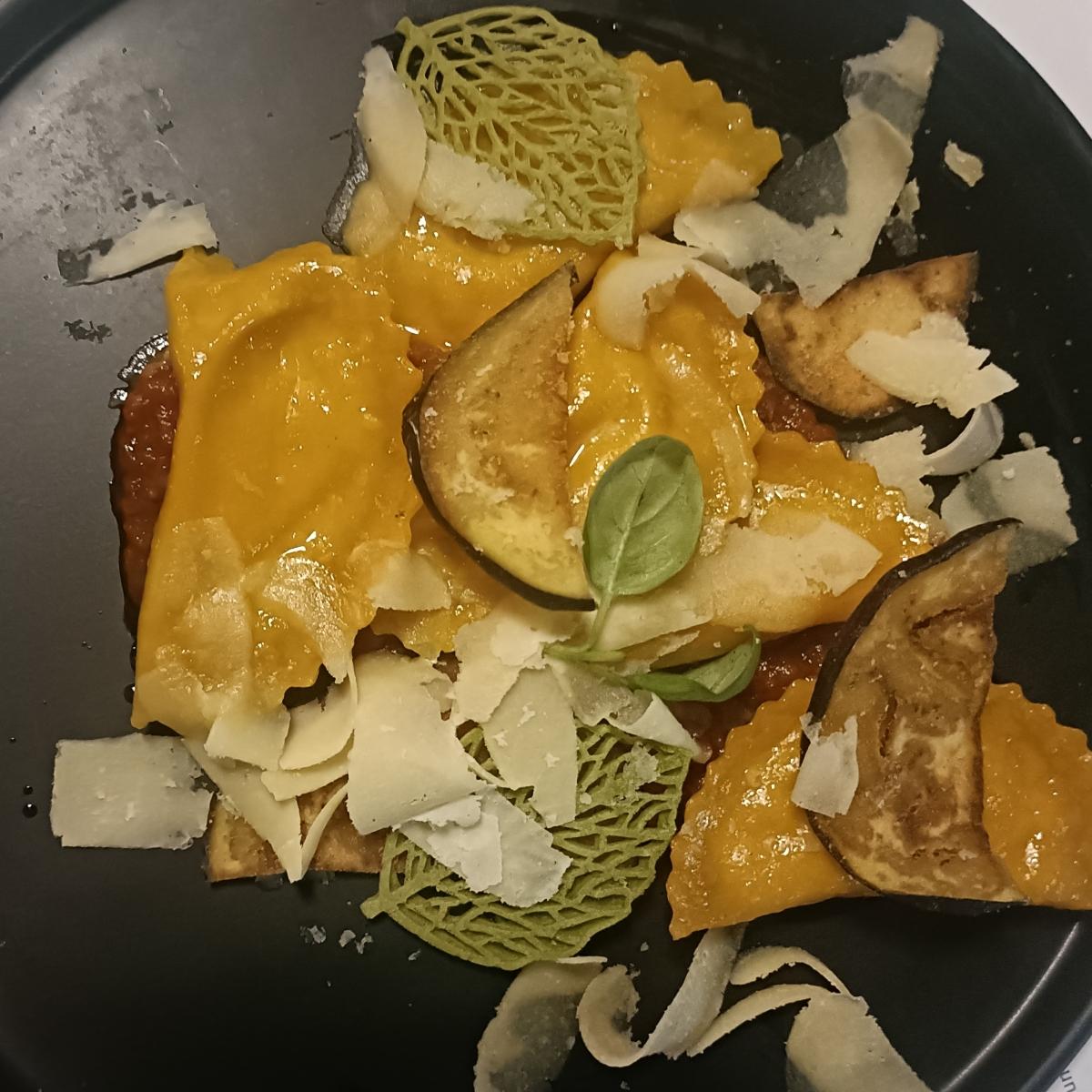 Ravioli ripieni di ricotta veg affumicata, datterino, melanzane croccanti e basilico... Spaziali! Veramente buoni e gusti ben bilanciati