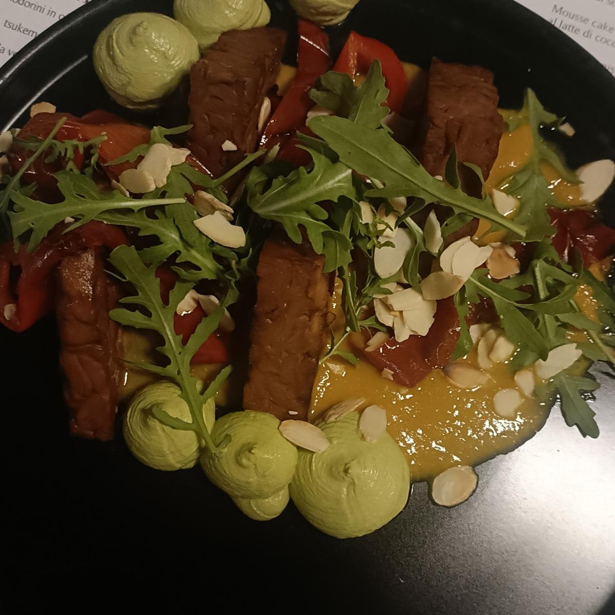 Tempeh marinato con tamari e lime, peperoni cornetto, mandorle in scaglie, rucola e crema di peperone giallo. Molto buono!