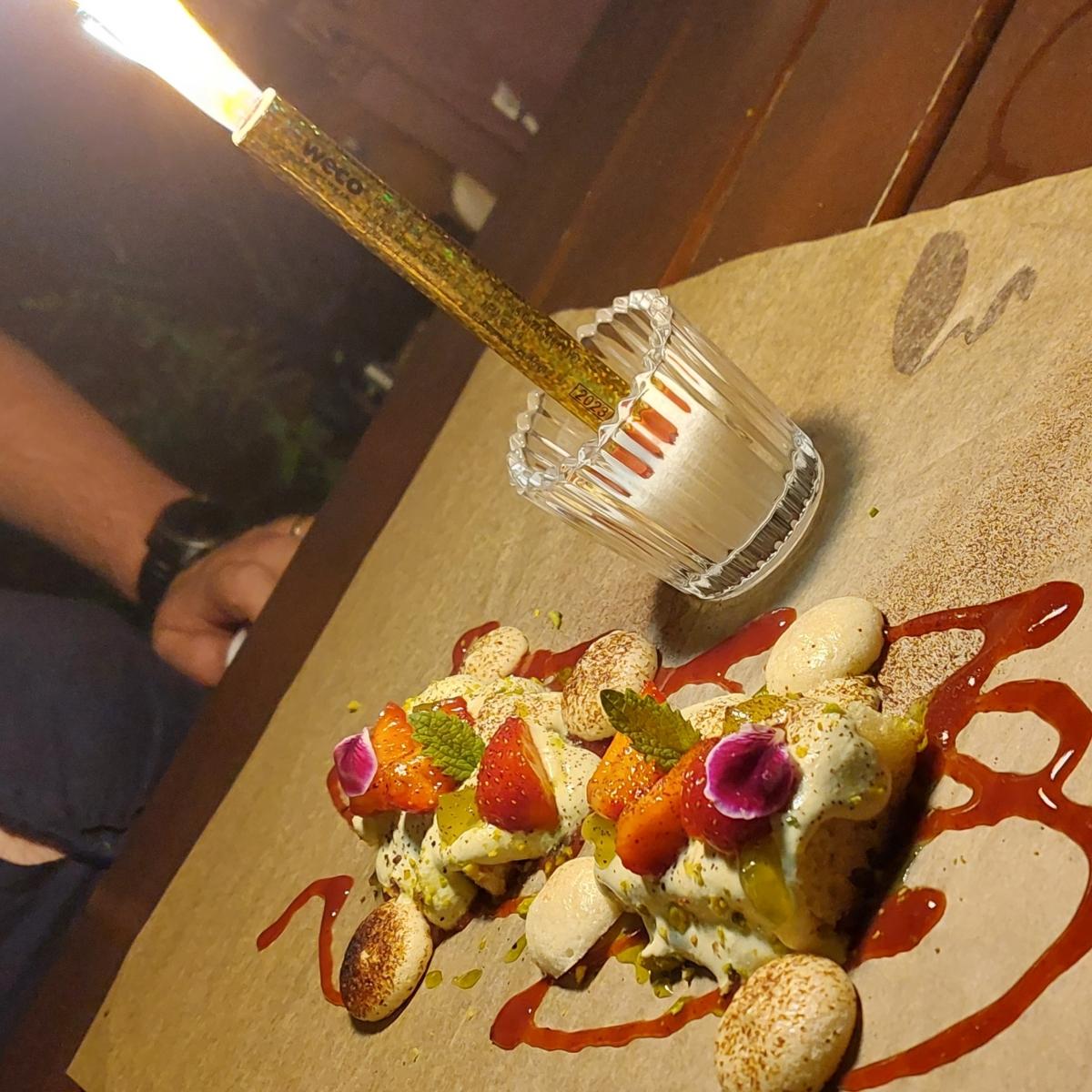 Before the month passes and the intensity of the memory fades away, let me review this dessert (which was preceded by a #sodelicious pre-dessert). It was the most spectacular thing, as the apprentice chef prepared it directly ON our table :D as you see, there are no plates, just a thin oven paper to avoid a big mess. First he draw on the paper with some #coulis , then he added the #lime #biscuits, the #meringue drops, the #strawberries and the #pistachio #cream . So fun, so original, so good!