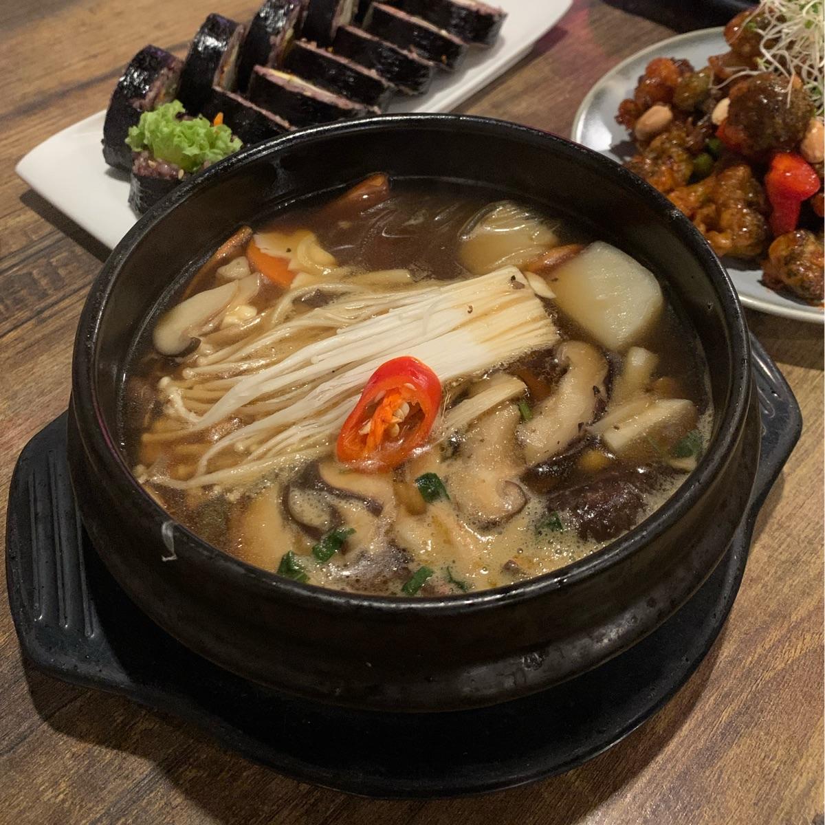 A great option when you’re looking for a warm stew filled with mushrooms and packed with flavour. Comes with glass noodles in the stew, a bowl of rice and a tray of side dishes. ✨