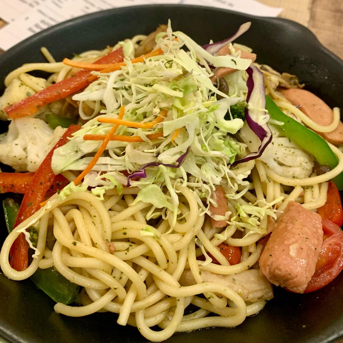 Aglio-olio style with vegetables and vegetarian ham. A simple, unassuming dish served beautifully on an iron pan —nothing too fancy but tastes just like a carefully prepared home-cooked meal. ✨