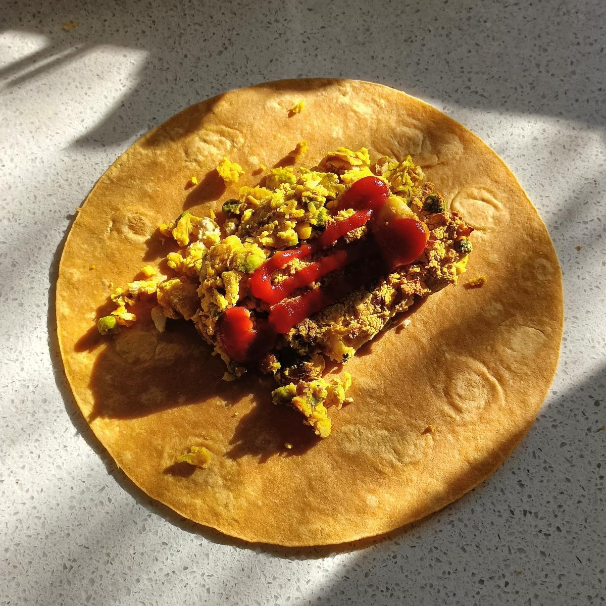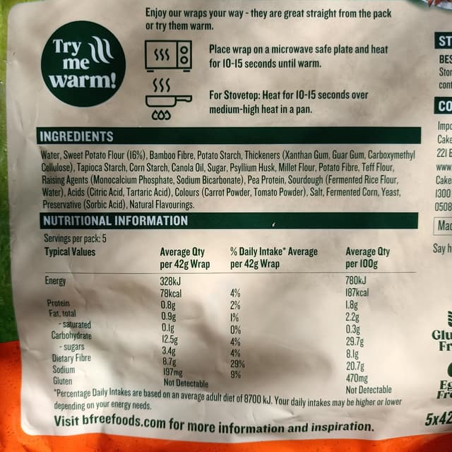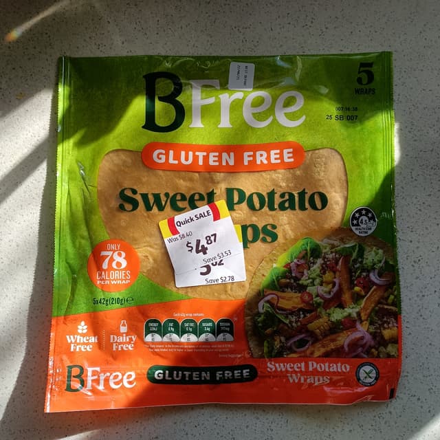 These are dreadfully expensive at full price but I got these on quick sale. Pleasant orange colour. Any sweet potato flavour is quickly concealed by fillings, and this stuff holds up alright as a wrap despite being gluten-free. Pictured with a turmeric bean bake! #wrap #veganwraps #glutenfree