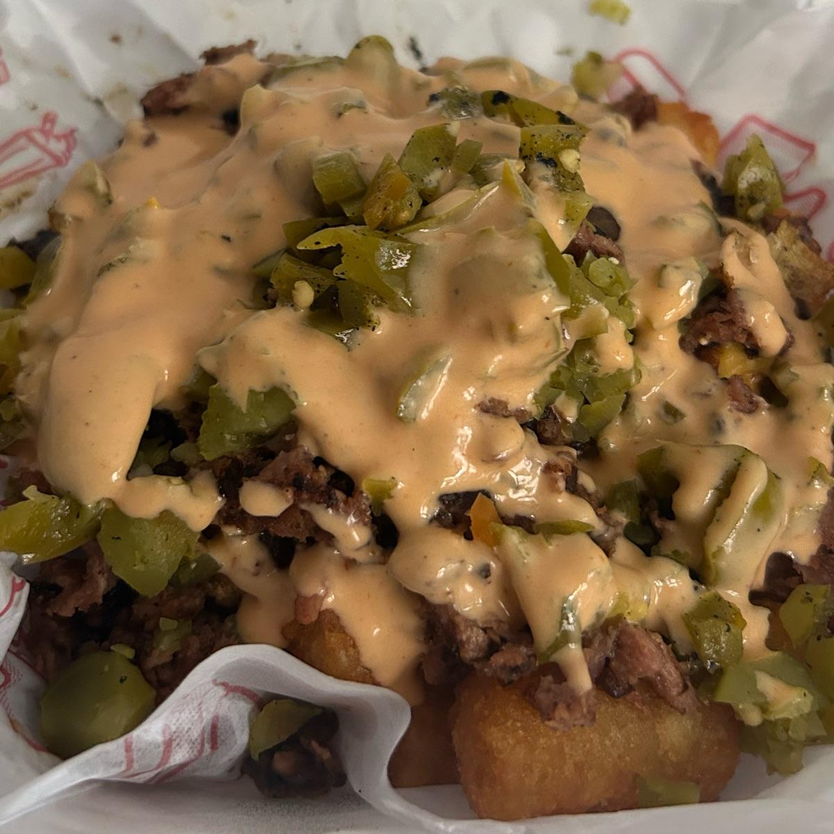 Delicious tater tot’s with beyond meat, chopped pickles, jalapeños and cheddar cheese. Expensive but delicious!