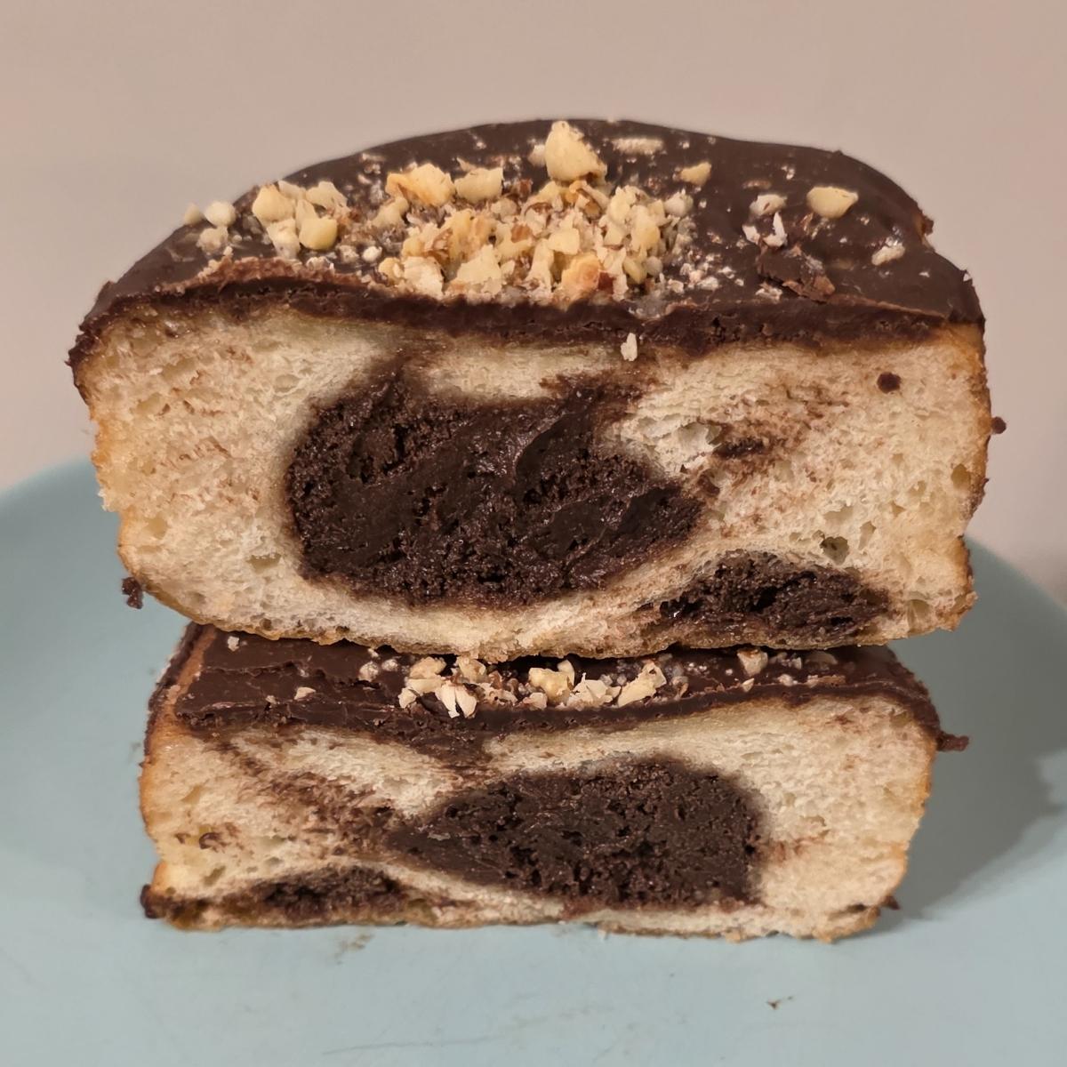 This donut was delicous! It was big so my husband and I split it to share. It has a nutty sprinkle on top of the chocolate glaze and the ganache filling was divine!!
