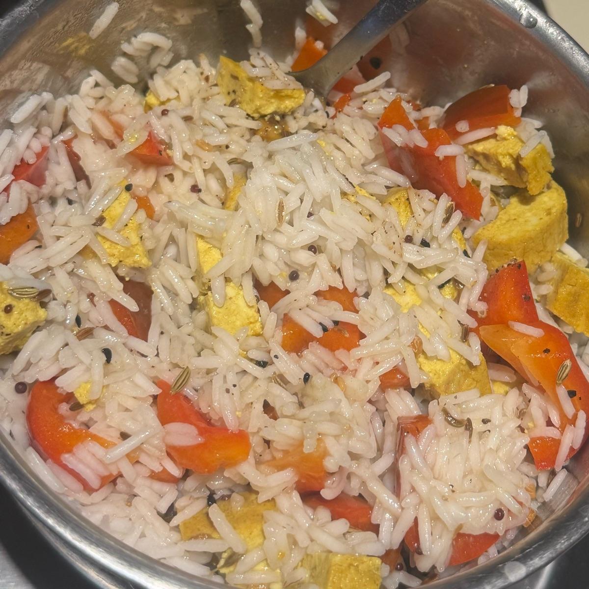 I braved the heat and cooked rice 🥵 with bell peppers 🫑 and tossed in diced tofu and my 5-seed mix. after the foto, i added a little turmeric.