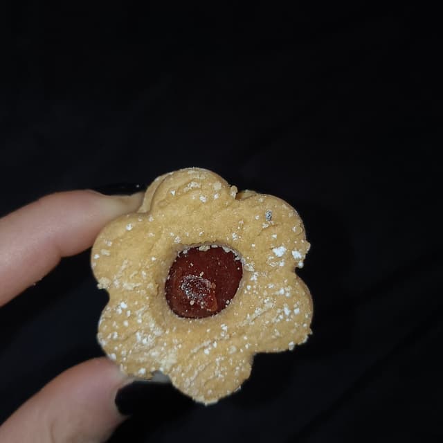 Ooooooh chewy red raspberry jam!!!! And sandwiched by the cutest flowery shortbread-esque biscuits 😝 #raspberry #cookies #biscuits