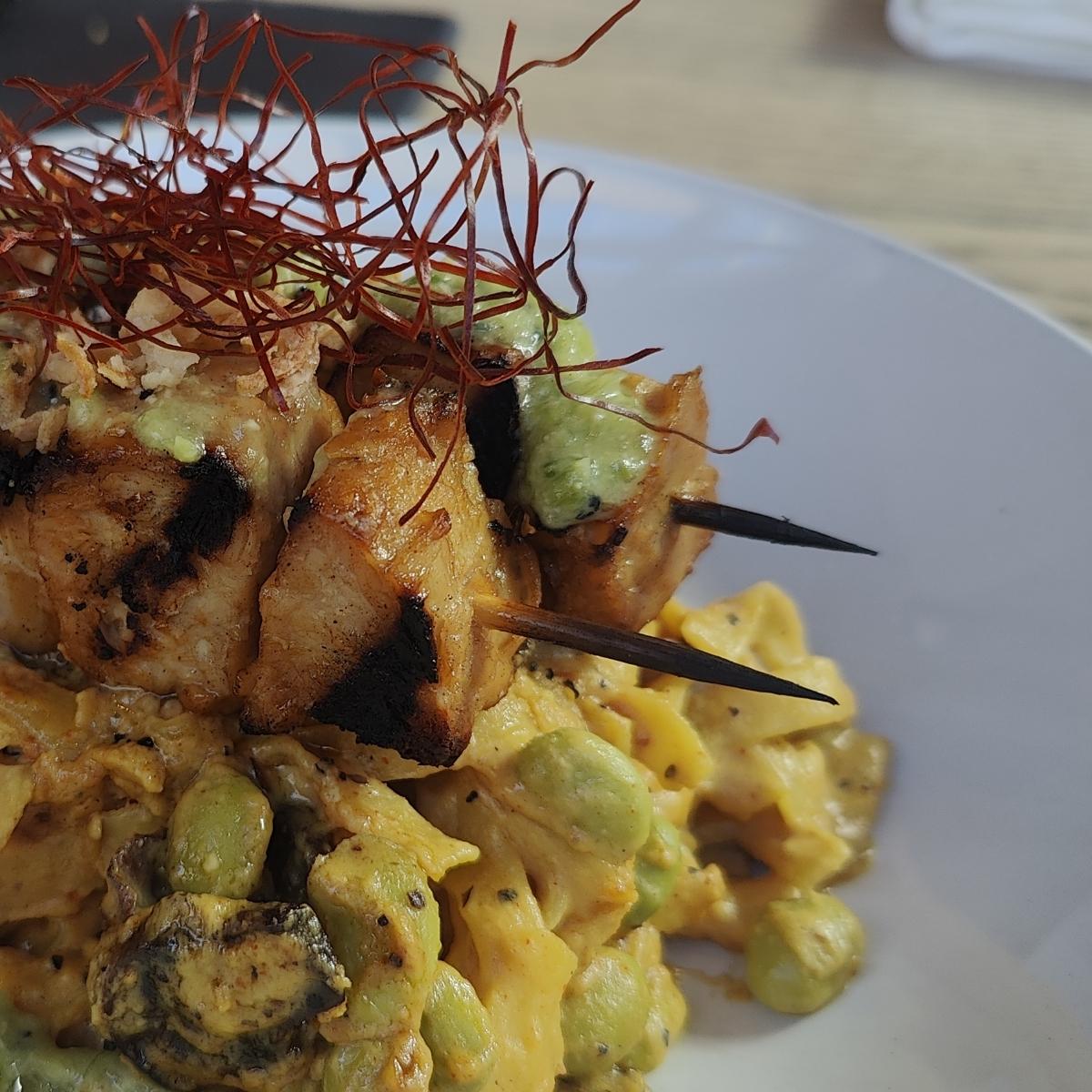 This is a really tasty and filling dish that is beautifully presented. The only issue is the vegan chicken they use is too rubbery to be pleasant in large chunks needed for skewers. At best it can be used as small pieces... Suggest they change brands or switch to mushrooms or tofu.