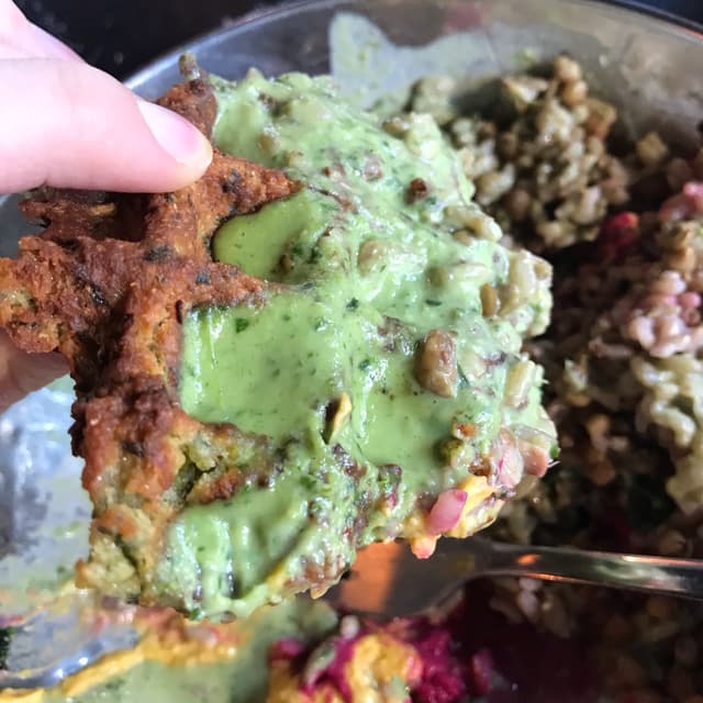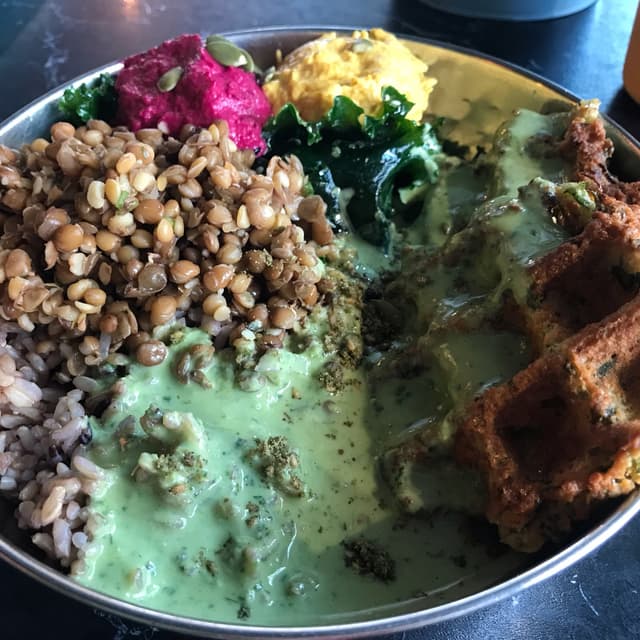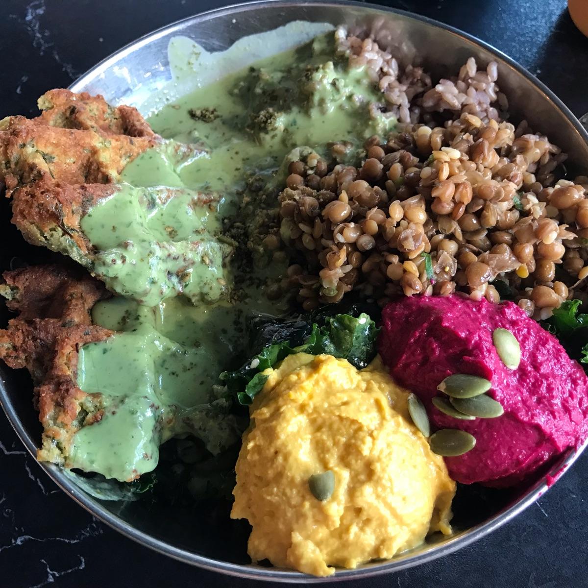 ‘Warm falafel waffles, beetroot & carrot hummus, kale, lentil salad, brown-black rice & creamy herbed tahini dressing’
