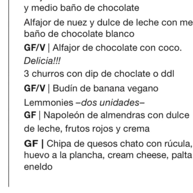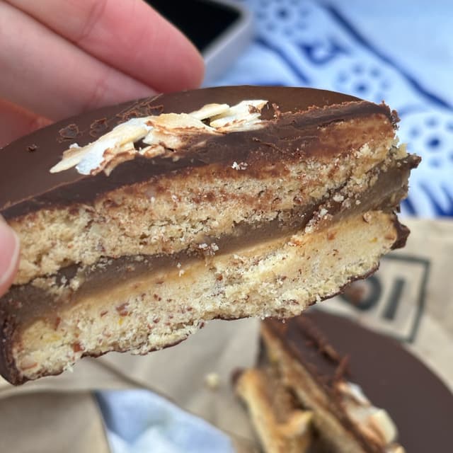 Super triste enterarme que ya no tienen la opción de la torta vegana matilda apta vegana. Ahora el menu ofrece un budin de limon/budin de banana y este alfajor que muy bien nose de que es ni qué relleno tiene porque sólo dice alfajor de chocolate y coco que sabor a coco no tiene, sólo tiene unas escamas de coco encima. Se le siente un leve sabor a citrico. Estaba bien pero nose si volveria a comprarlo porque 1) carisimo 2) las tapitas muy duras