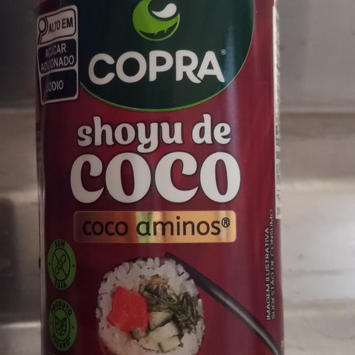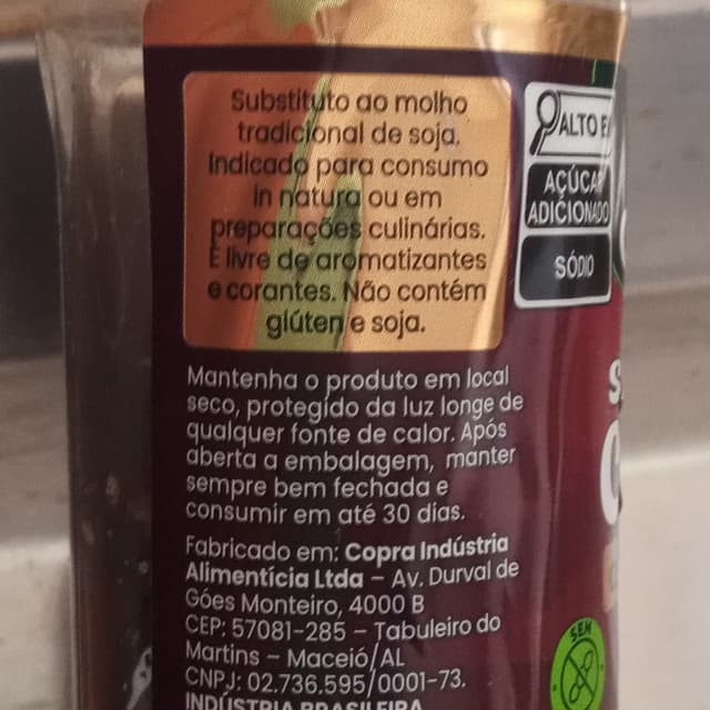 Shoyu de côco, contém açúcar de côco, tem o selo vegano e substitui o molho shoyu, sem glúten e sem soja.