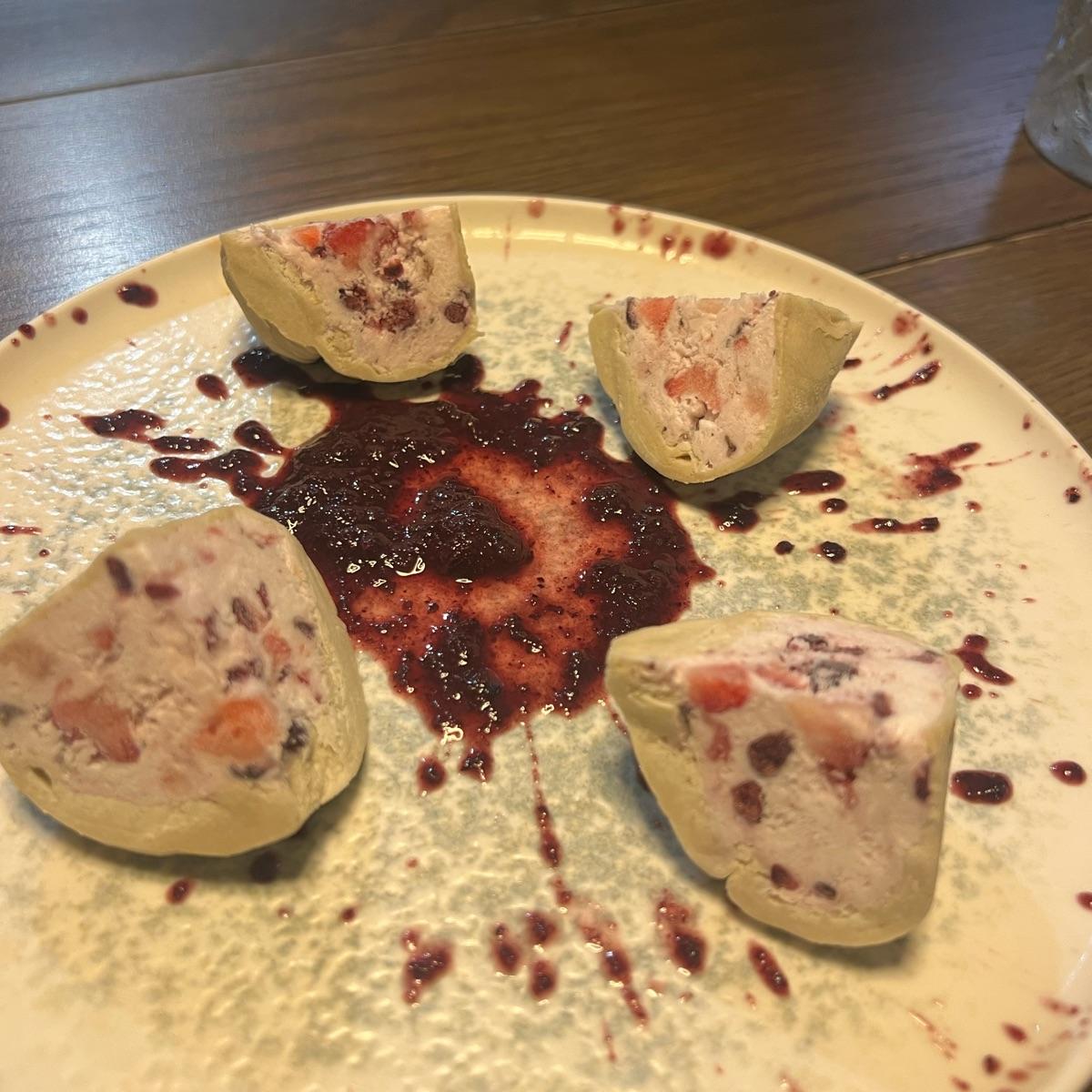 Didn’t taste like matcha really at all lol but the little specs inside are berries which is yum. The shell was too hard though. I’ve had supermarket mochi better than this 🫤 Its just alright
