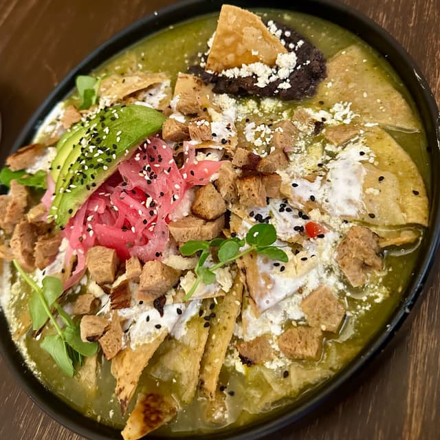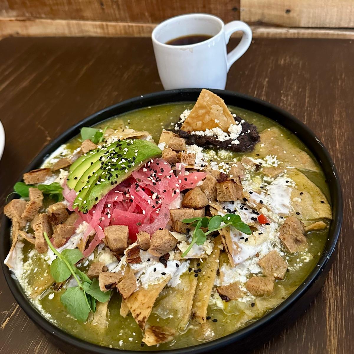 Otro desayuno bastante recomendable son estos chilaquiles verdes que también puedes pedir con salsa roja. Llevan queso y crema de tofu, cebollita encurtida, cilantro, aguacate 🥑 y frijoles refritos. Por $25 puedes agregar alguna proteína, yo elegí pollo de soya aunque también hay sudadero de soya, huevo estrellado vegano, tofu a la mexicana, salchicha de soya o tofu crujiente. Hay varias opciones para complementar tus chilaquiles 😋👍 #veganchilaquiles #tofulover #soymeat #vegancheese #veganforlife