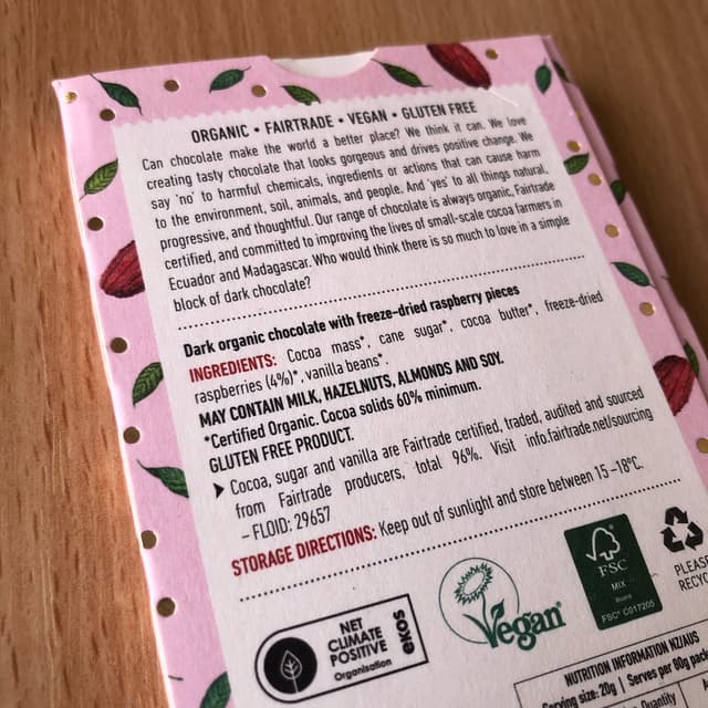 It’s a slender and rich bar with minimal ingredients. It’s wrapped in foil inside so is plastic free.