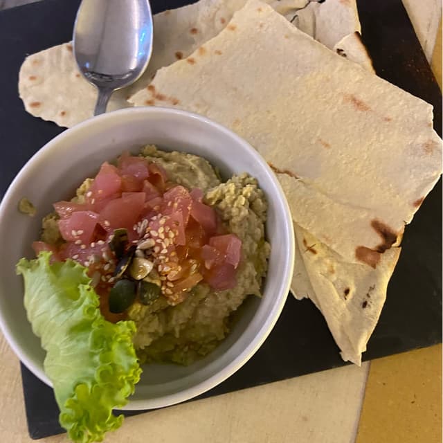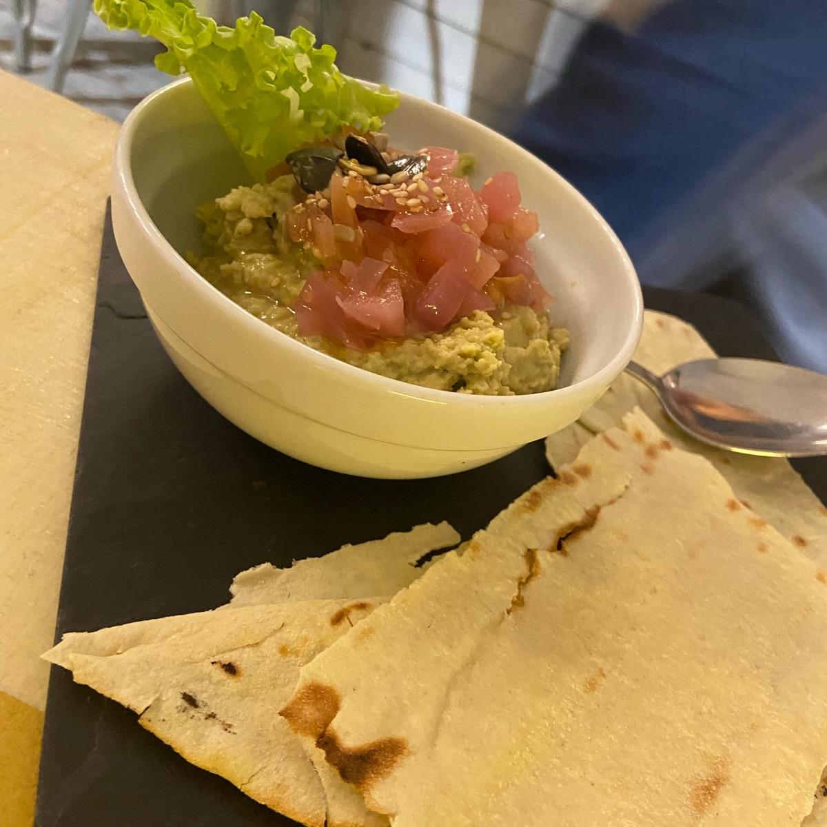 Tra gli antipasti abbiamo provato l’hummus di ceci con semini e accompagnato da croccante pane carasau, non male, freso e cremoso - caro €9,50 #hummus #hummuslover #antipasto