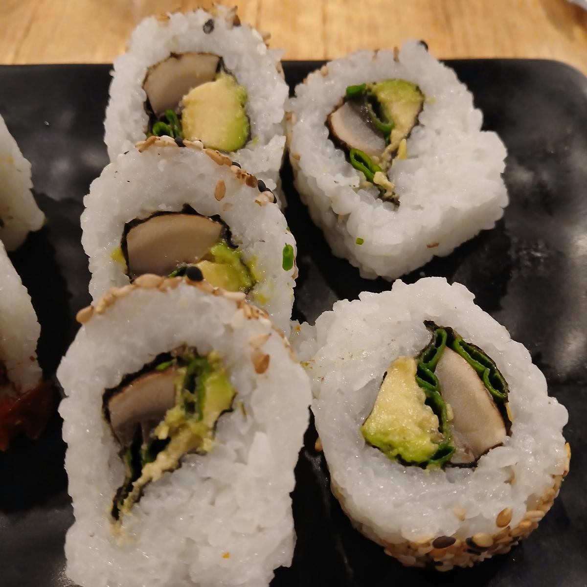 Roll de hongos portabellos, palta y cebollita de verdeo. De mis favoritoss. El local es chico pero bonito. Cuando pedis para comer en el lugar, la opción es tenedor libre o 15 piezas con bebida. Dado que solo hay 3 opciones veganas, no podes elegir mucho. Con las 15 piezas, en mi caso, me llene bien de más. #hongos #sushilover #sushi #palta