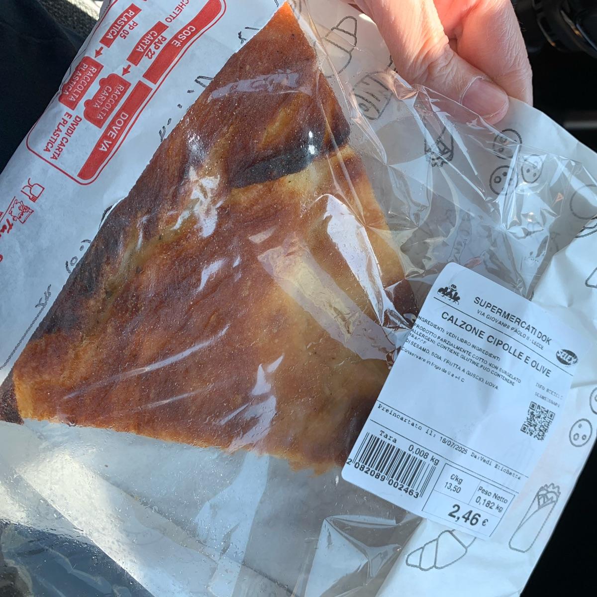 Deliziosissima pizza rustica, chiamata a Lecce calzone, bella unta con cipolle e olive, davvero buona buona e buona! In questo supermercato ci sono un sacco di fuse per noi vegani, sono rimasta colpita.