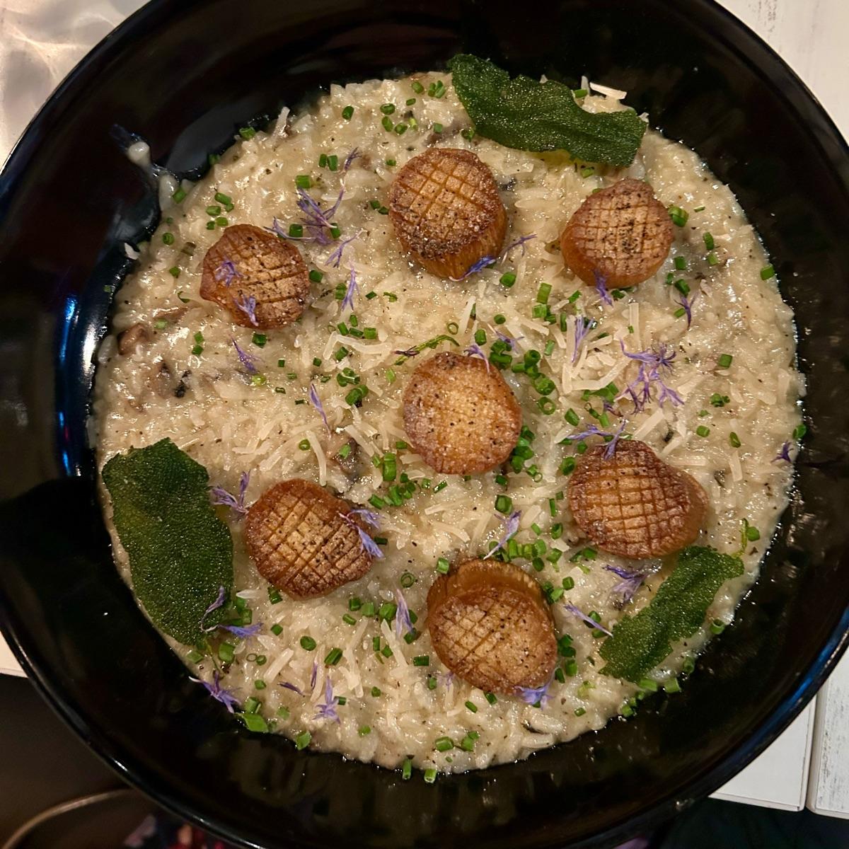 The mushroom scallops are really great , loved the consistency and flavor . The risotto had a lovely “ Parmesan “ cheese flavor , and was nice and thick. A little heavy on the salt though .