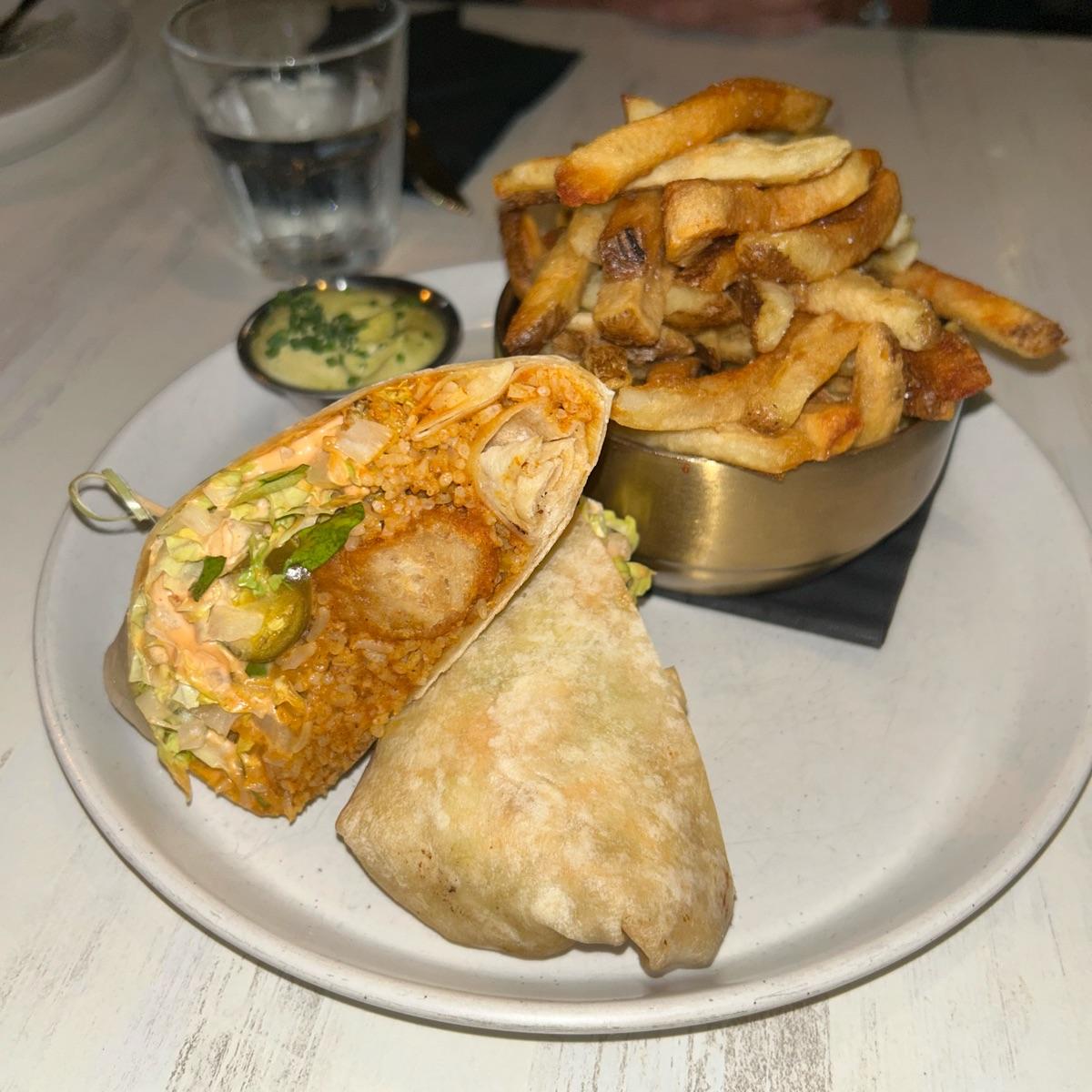 My grandmother had this dish, which I tasted #forthereview. It was so yummy!! The butter ‘chicken’ was saucy and rich and creamy and it paired nicely with the salad and fried jalapeños. My grandma also found it delicious, and she is not vegan! The fries are also amazing here, dipped into this yummy herby aioli.