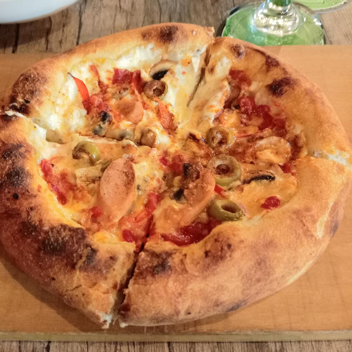 Lleva queso de almendra, chorizo (aunque a mi me parece más hot dog, aceitunas verdes, champiñones, pimento y pimentón de la vera).
