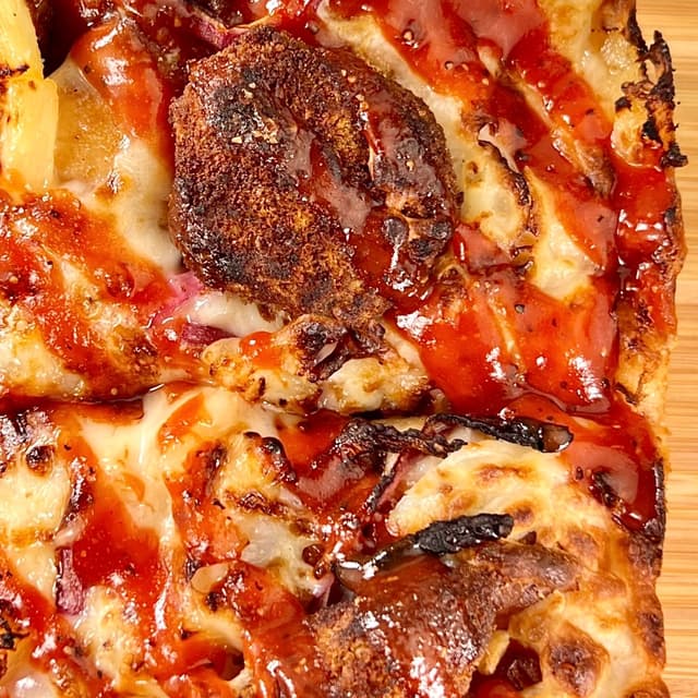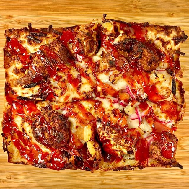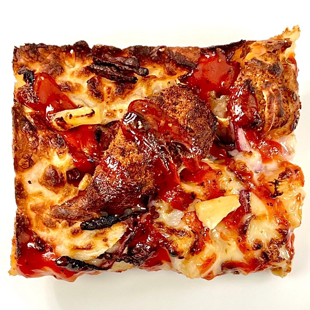 This consisted of luscious melty GOOD PLANeT Foods 🐄🥛-free mozzarella, red onion, lively, seasoned, crispy, meaty Buddy’s Steaks 🌱-based fried 🐥, pineapple, and sweet and tangy BBQ sauce on a thick sourdough crust with crisp edges and a light and airy crumb inside. This had a fantastic combination of delicious flavors. It can be made gluten-free.