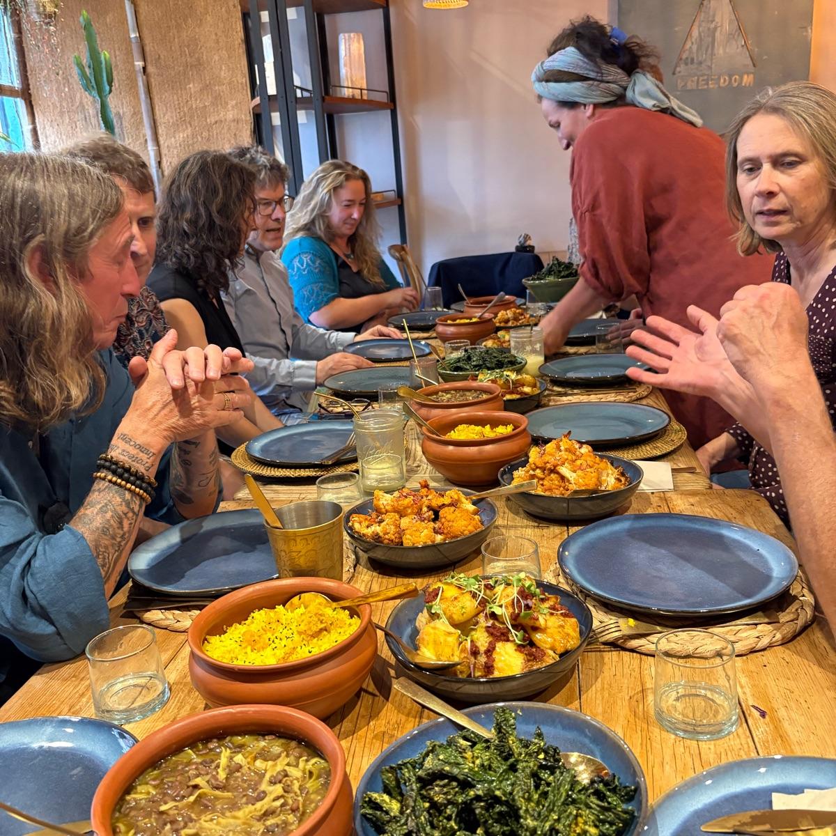Amazing as always! Delicious crispy kale with nooch, potatoes, a cauliflower dish and a aduki bean dish.