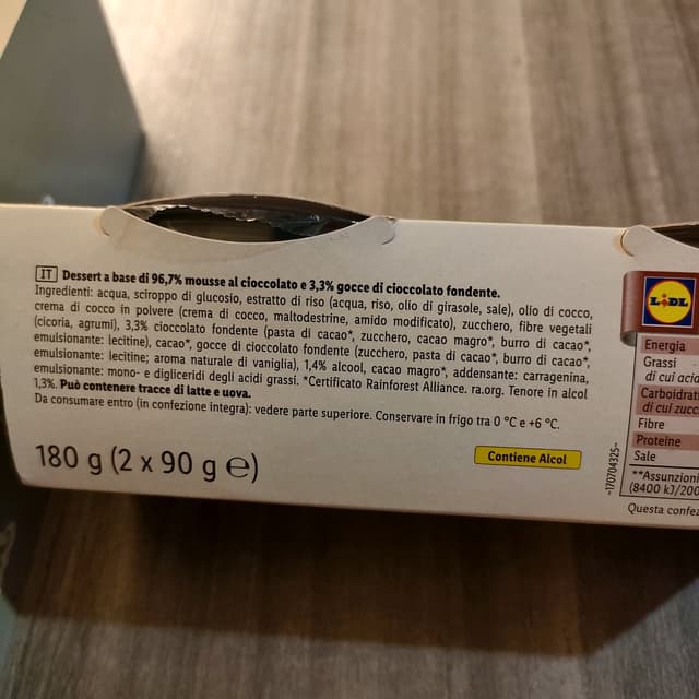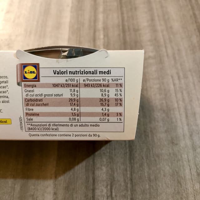 Non è male in sé, è anche bella piena di gocce di cioccolato e con una buona consistenza,ma per i miei gusti si sente troppo l'alcol puro, quando se fosse un buon liquore non sarebbe un problema.