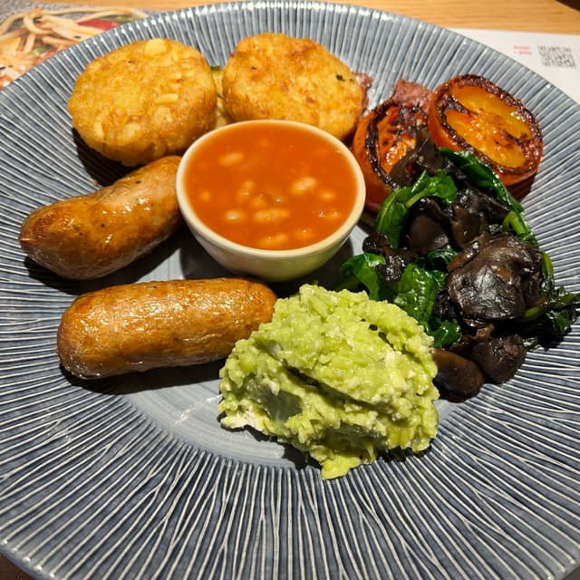 🥓 #fullenglish #breakfast here. Very yummy. The #vegansausage is scarily realistic and juicy. The #veganbacon is hiding but sublime. I’m pretty sure it’s THIS isn’t bacon. Great🥔 #hashbrowns which I got an extra one as the bread wasn’t vegan today the waitress kindly pointed out. The #spinach 🌱and #mushroom was welcome. The only part I’m not crazy about 🍄‍🟫is the🥑 #avocado #tofu 🫛smash as it’s cold which feels wrong with a cooked breakfast. #veganbreakfast £15