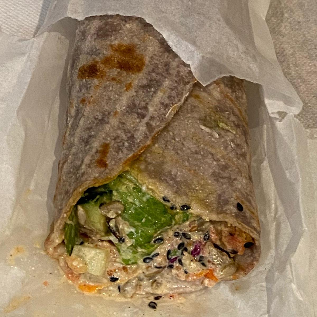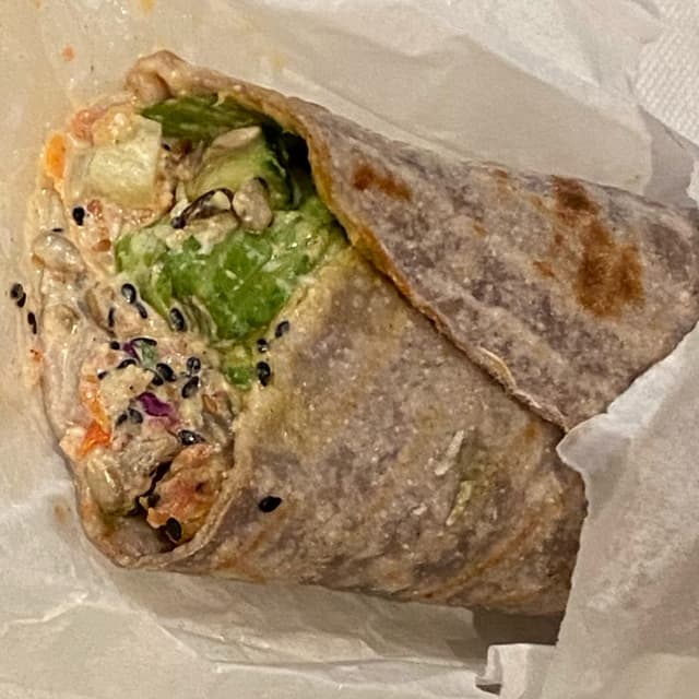 Plant based steak pieces, vegan cheese sauce, tomato relish,avocado, tomato,sprouts,cucumber in a gluten free wrap.