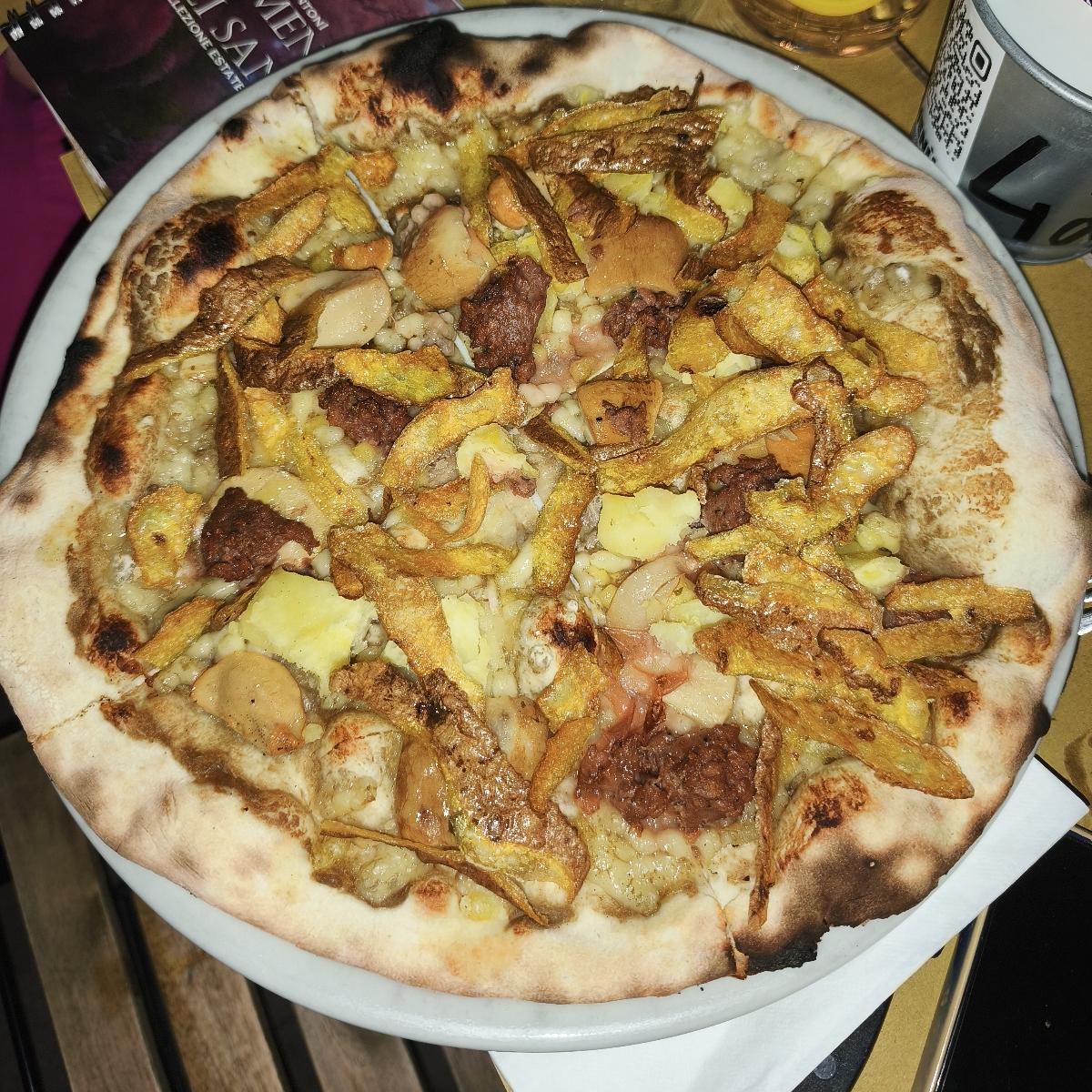 Nella pizza ci sono le bucce croccanti delle patate, salsiccia veg, crema di funghi, mozzarella veg, patate lesse e porcini