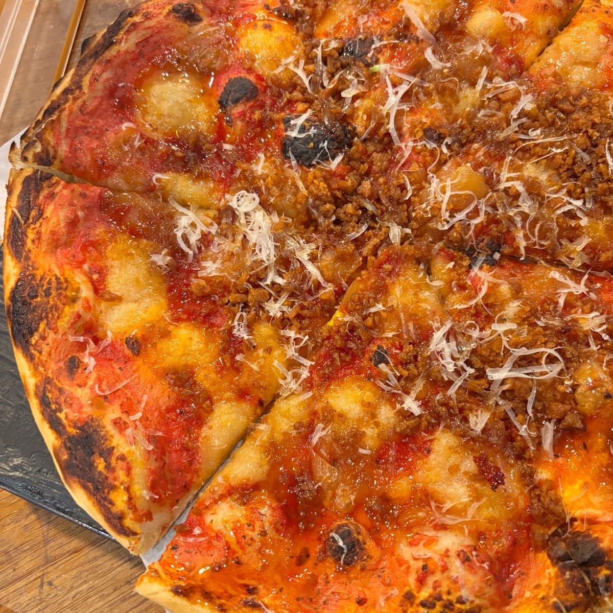 This fully vegan restaurant has tons of pizza options ! I had this one cause it was on the happy hour menu lol ; very good, honey, smoked bacon and parmesan ! Very sweet but it was expected.