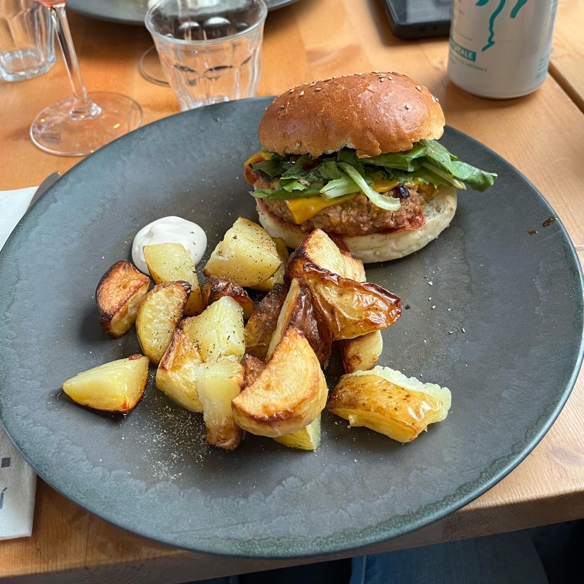 Molto delusa da questo ristorante. Avevo aspettative alte visto che è il terzo ristorante nella lista di quelli vegani di Milano. Questo burger è fatto da loro credo con granulare di soia e non è male ma neanche godurioso. Patate buone ma niente di che. Porzioni piccole e prezzi alti. Per me è un 👎