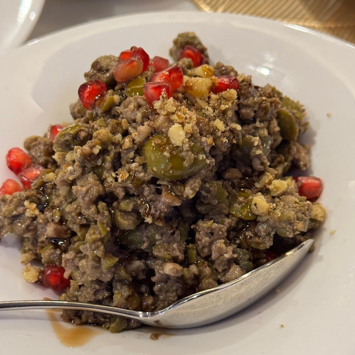 If you love olives, this dish is like literally slapping a load of olives on your face! Crazy blend of olives, walnuts, herbs, spices and pomegranate with a tinge of vinegar. $16 for this portion