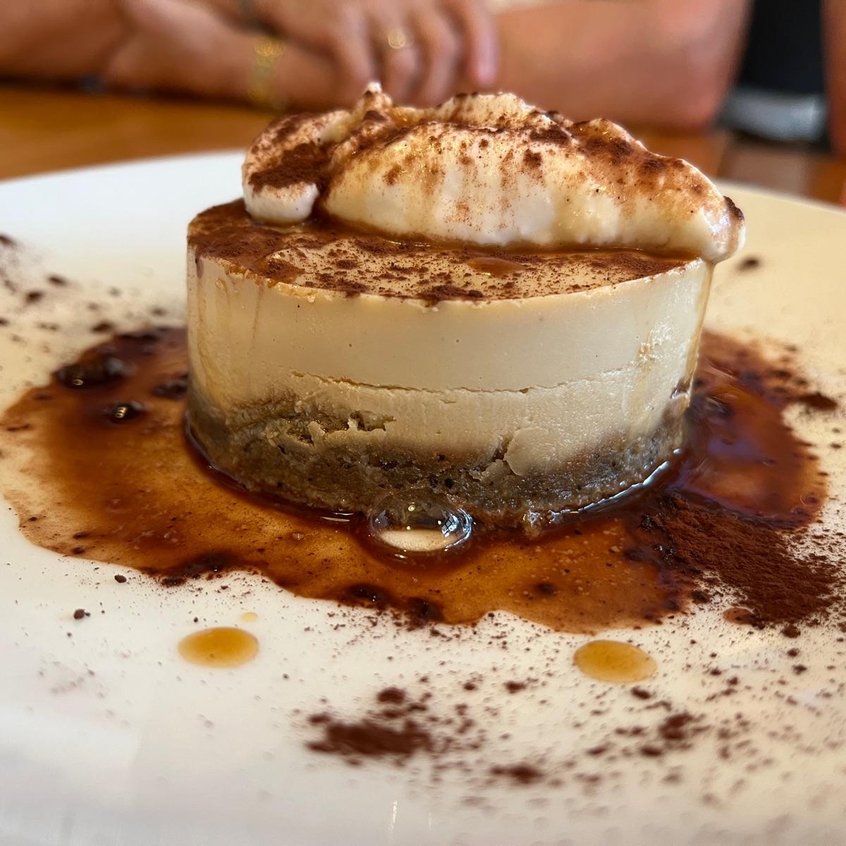 ☕️ #tiramisu made from #cashew and #coffee and unusually #lemon. 🍋It was very nice and a good contrast of textures and flavors. Oh I forgot the #almond #cookies crust. Lots of us struggled to sleep after eating this so maybe it was very strong coffee. I really liked it and loved this place which used to be #plantbased 🌱until they had to include omni options to survive. It was great to bring my omni family then. They are only open in the evenings for summer but supposed to open for lunch again in the fall. Can’t wait to go back here to try a tomato based pizza and their plant based meats. I might order one to be delivered. This was $12. #veganitalian