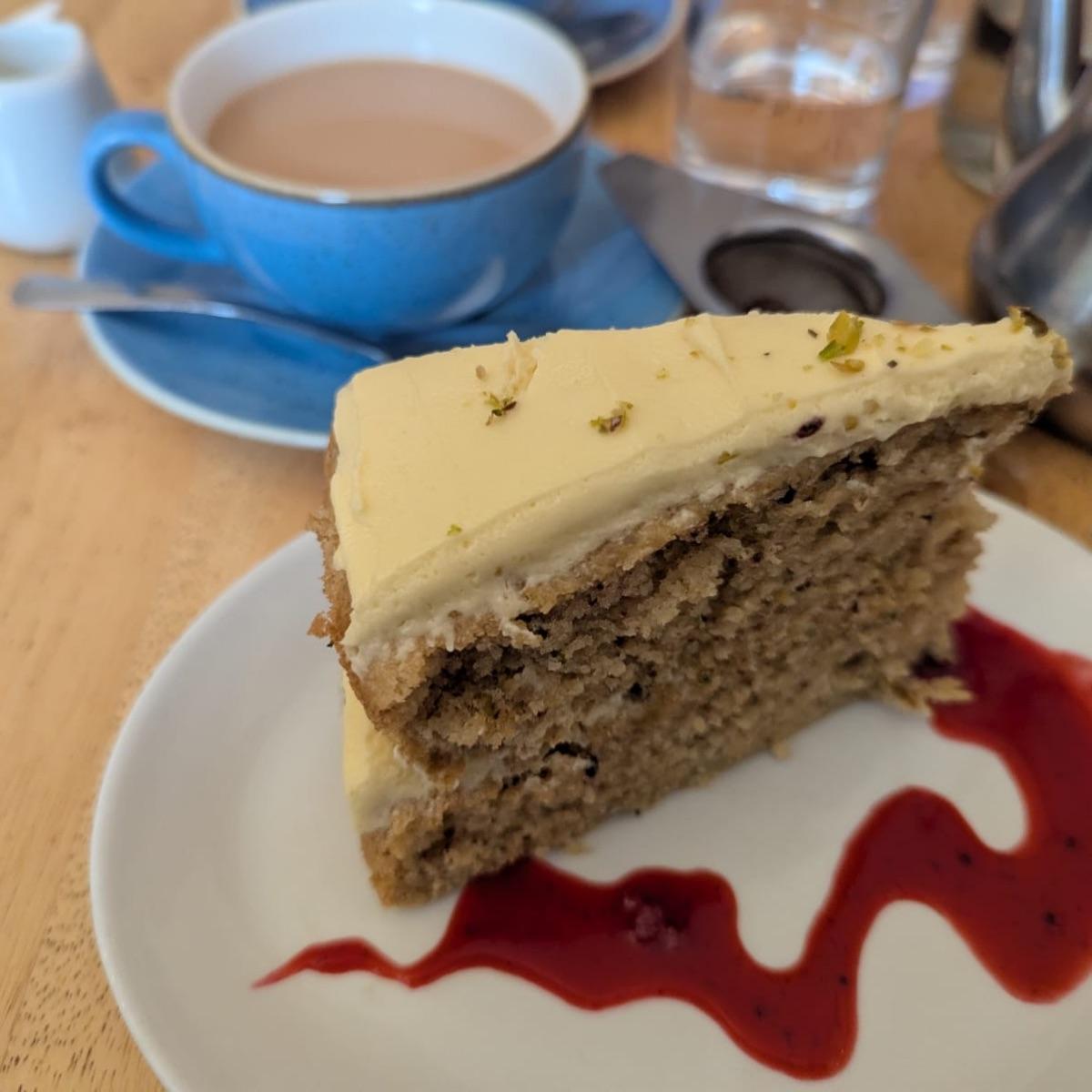 Almost all the food/cakes here are vegan. I was in heaven! So much choice. We had cake and coffee. I had chocolate cake (eaten before thought to take a picture đź¤) and partner had coffee cake - both vegan whoop! Was delicious and a really cute cafe