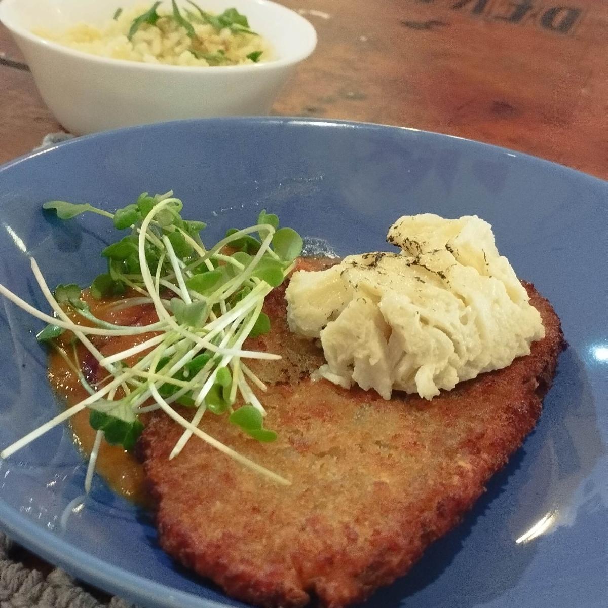 Berinjela a parmegiana, acompanhante de arroz e salada. É muito, muito, muito gostosa. Mas eu comeria umas cinco delas pra matar minha fome