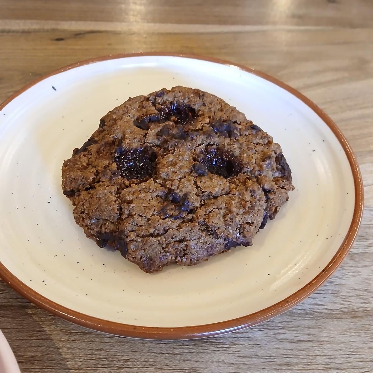 Galleta de chocolate, la verdad que no le sentí el sabor a chocolate. Con chips de chocolate y com pequeños corazones deframbueza, que tampoco tenía tanto sabor. Única opción vegana, por el momento, en la parte de panadería y cositas dulces. No se en que parte se siente las almendras, no las encontre en la galleta. #cookies #cacao #almendras #frambuesa