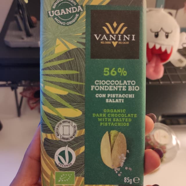 Buonissimo cioccolato fondente con pistacchi. Il tocco salatino del pistacchi e molto gradevole.