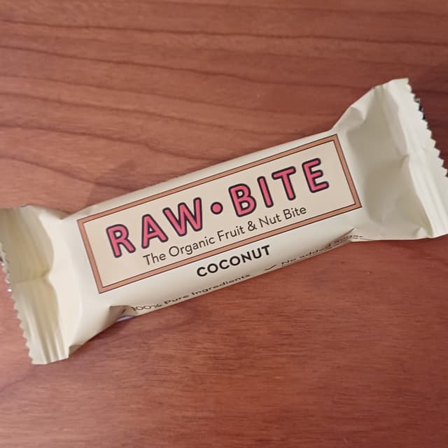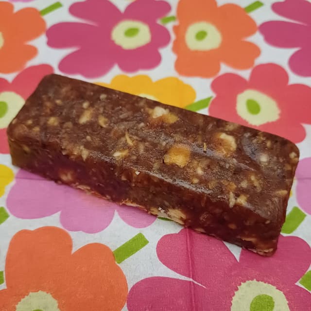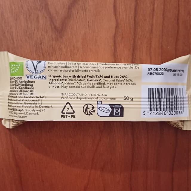 Barretta biologica crudista a base di datteri, anacardi, cocco in scaglie, mandorle e uvetta in ordine decrescente per quantità.