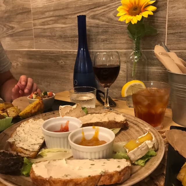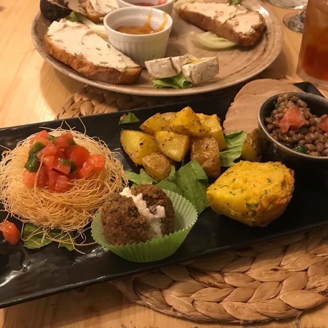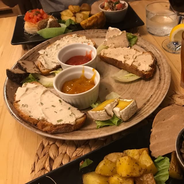 Spesso include sia affettati e/o formaggi vegani che piatti più semplici come crocchette o lenticchie condite.