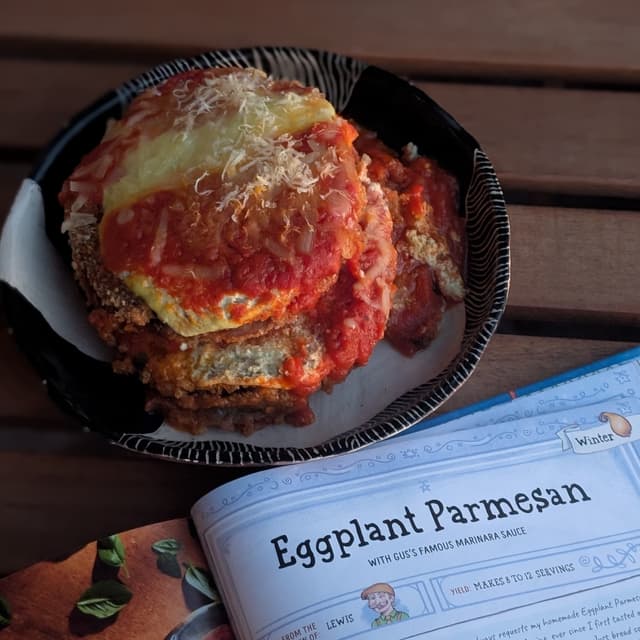 I've had the official Stardew Valley cookbook for a while now but I've never made anything from it. It is packed with animal products, but the recipes can be veganized if you have enough vegan cooking experience. @jonok brought home a monster eggplant that needed to get used up. I scoured my cookbooks for an eggplant parm recipe when I remembered that there's eggplant parm in Stardew! I made my own ricotta with MinnTofu soft tofu, and used Violife feta instead of goat cheese.