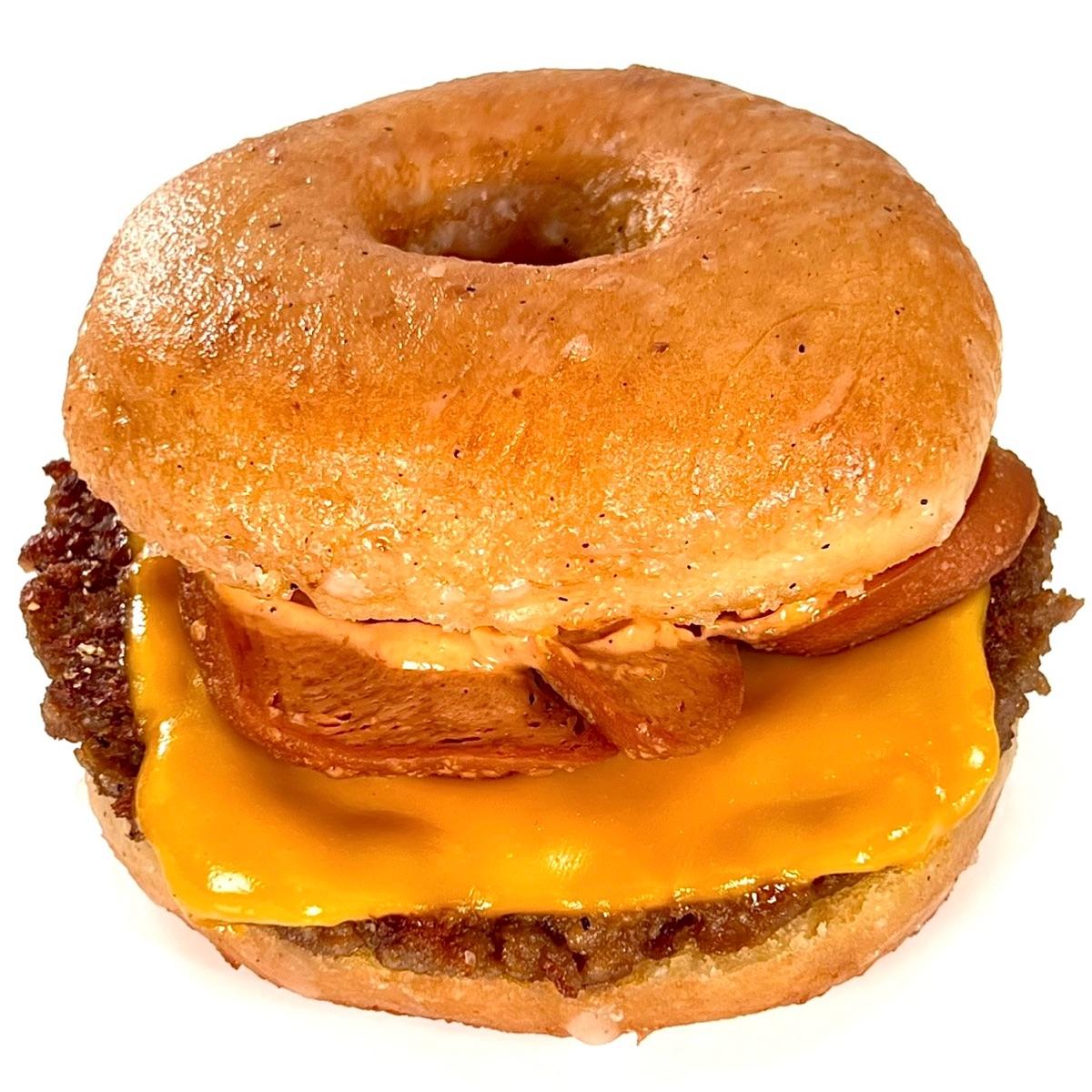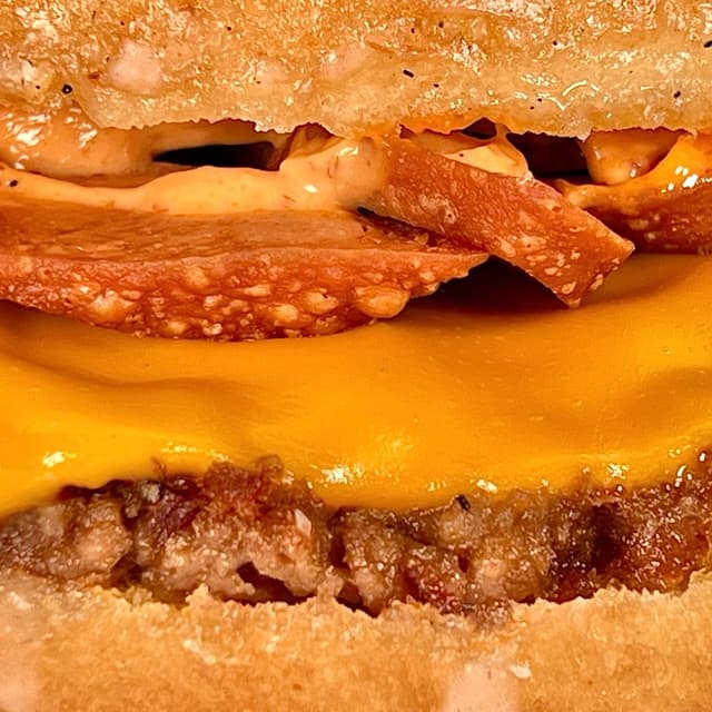 This consisted of a 🐮-free smash burger patty made with Impossible Foods and Before the Butcher, 🐄🥛-free cheddar, deep-fried animal-free hot dog slices, and chipotle mayo on a Doe Donuts salted vanilla bean glazed donut. Wow! This decadently delicious meaty, creamy, cheesy, sweet, and savory donut burger creation shows so convincingly that being vegan is not boring!