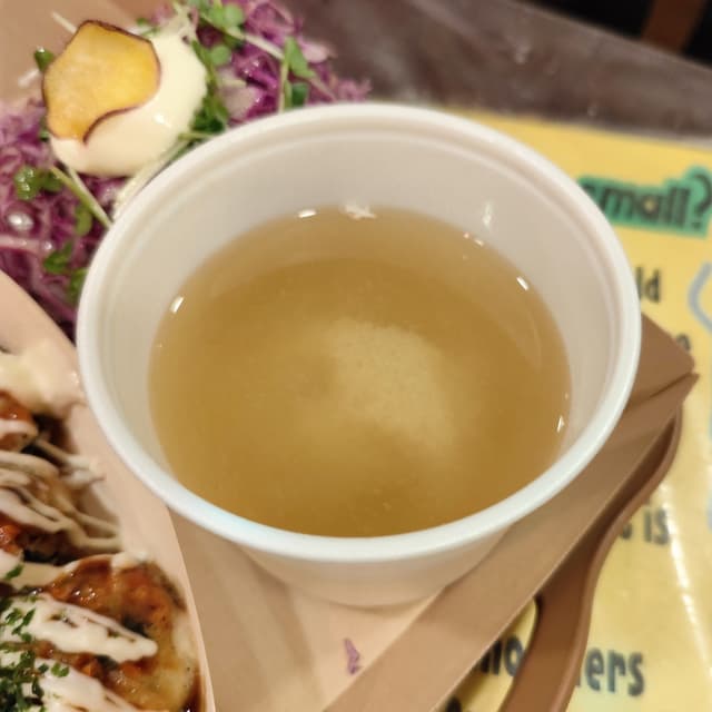 Acompañado de una pequeña ensalada de col morada y sopa miso.