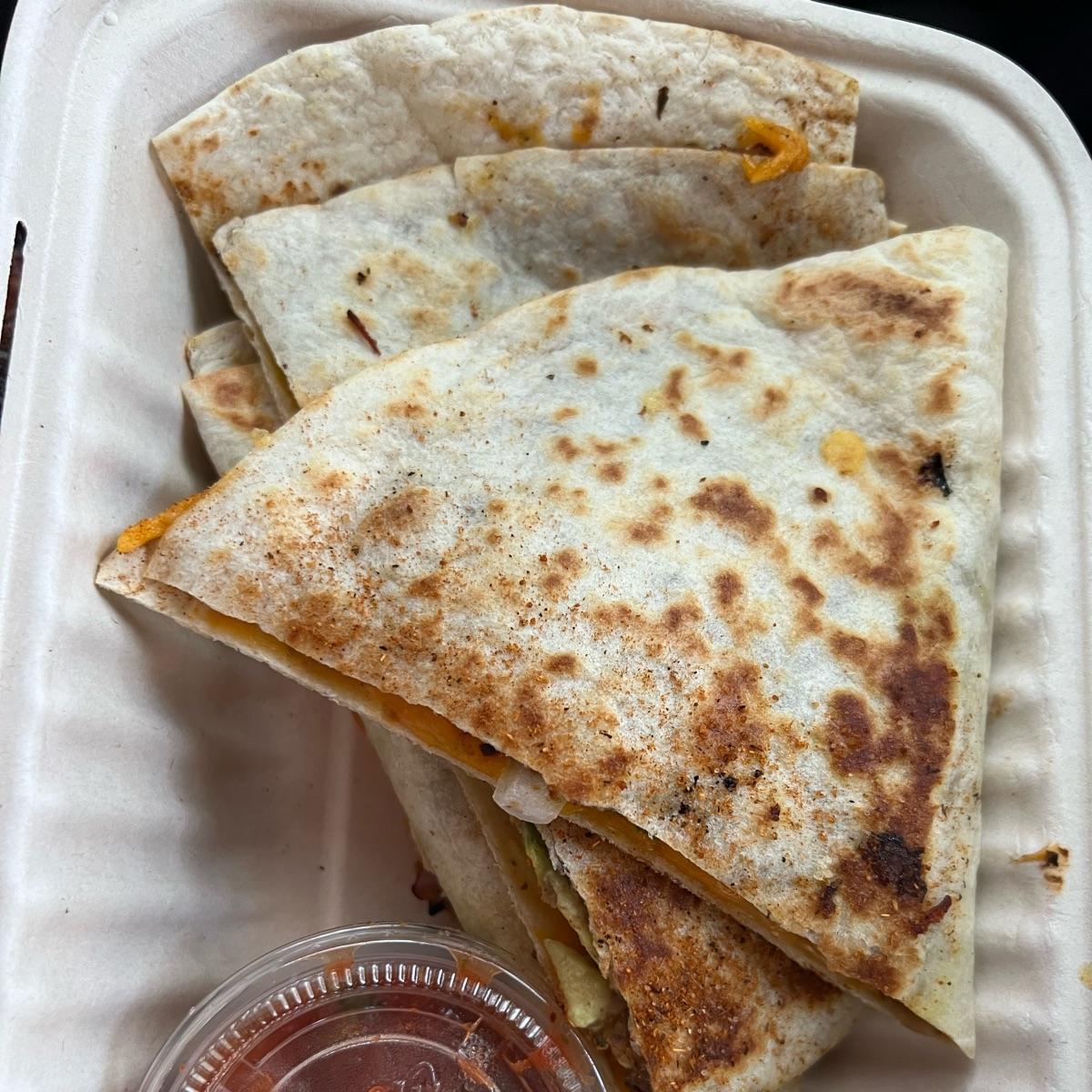 Specify vegan as they have a vegetarian and vegan version. They take their black bean dip, red onion, vegan cheese, and I opted to add avocado to mine and they dust the outside of the tortilla with spices. This was delicious and had a nice amount of kick to it.