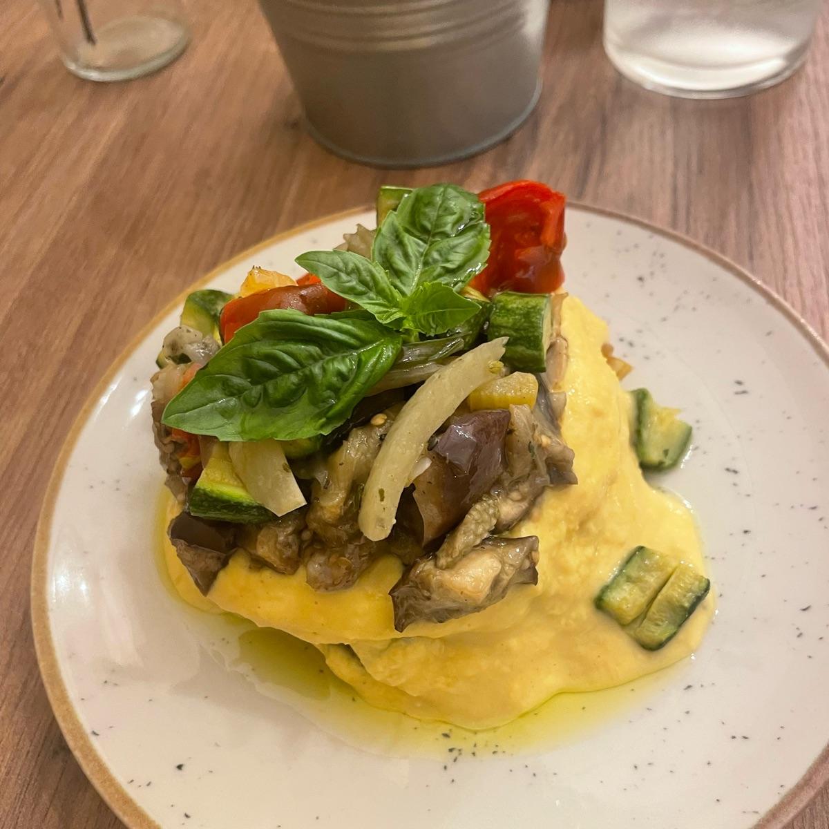 Io ho preso questo piatto: pancake salato con hummus di ceci, ricotta di mandorla, verdure di stagione ripassata e pomodoro concassé.