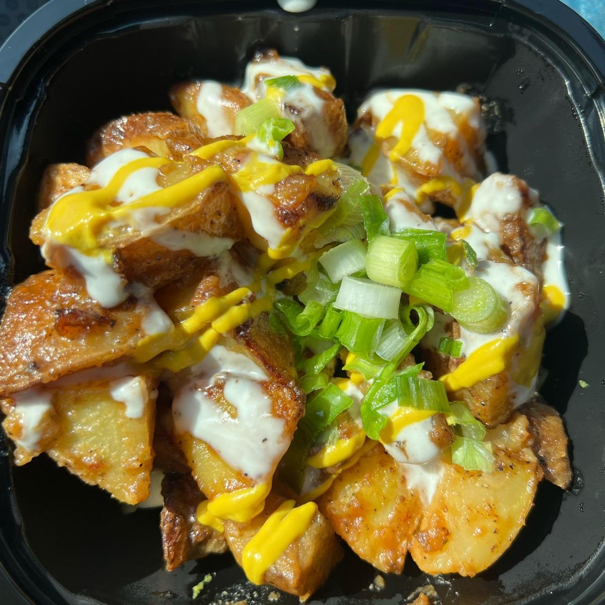 Grilled potato wedges tossed in a spicy peanut sauce with scallions, vegan mayo, and mustard.