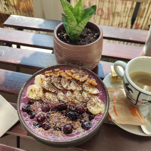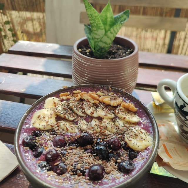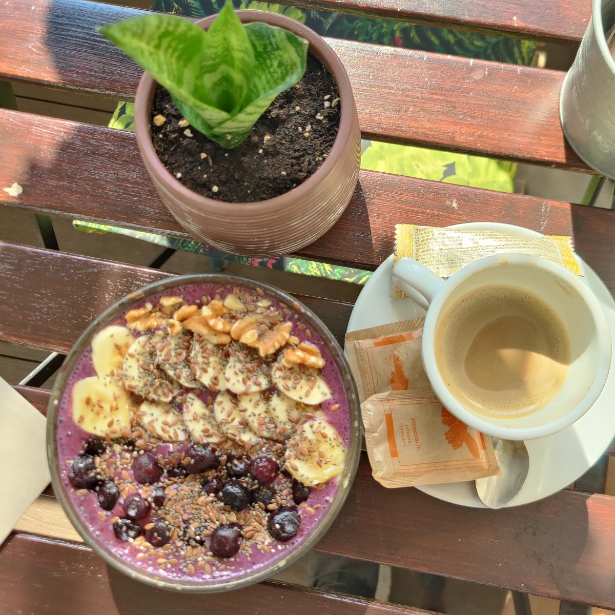 Had a really nice #breakfast at #balancebowl. The #blueberry bowl was really yummy, prepared with #blueberries, #bananas and #coconutmilk, topped with sliced #banana, frozen blueberries and some #wallnuts and #seeds. Loved it with every cell of my body 🤭😋